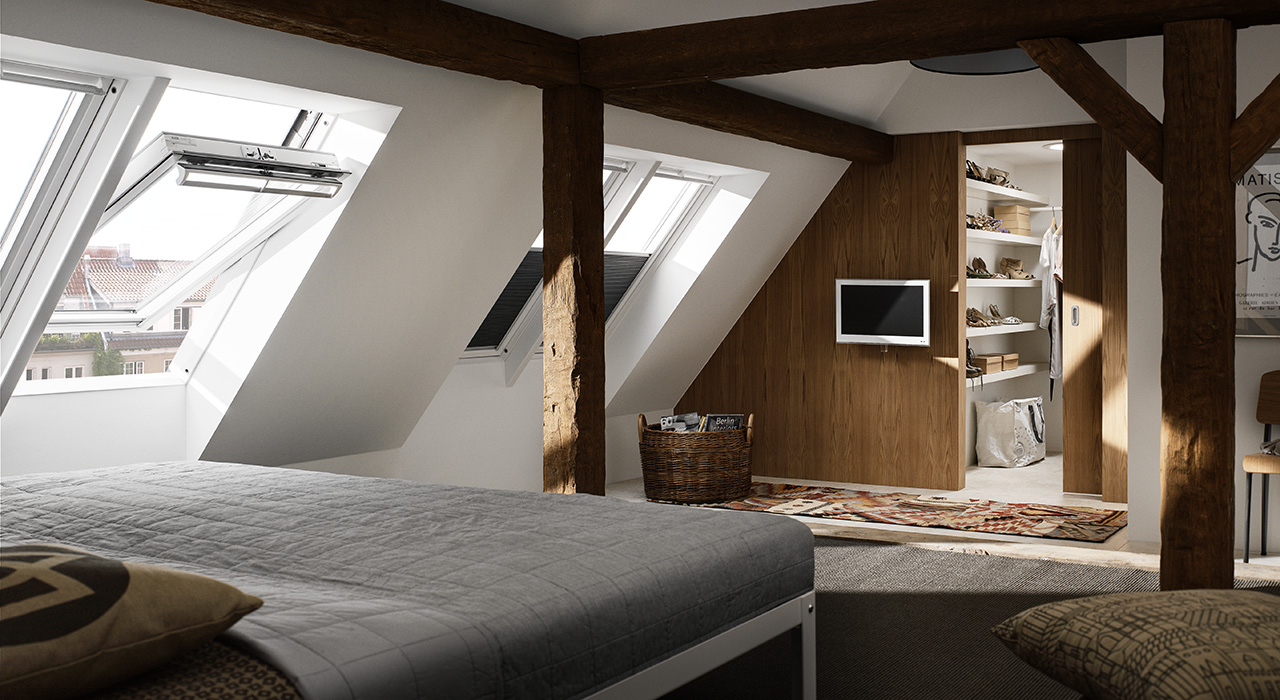 Gracias a un conjunto de ventanas VELUX, este dormitorio -ubicado en el segundo piso- cuenta con abundante luz natural. El práctico sistema de apertura superior de nuestras ventanas para techo inclinado VELUX hace que sea muy fácil abrirlas, incluso cuando la cama está junto a ellas. Además, las ventanas cuentan con cortinas plisadas grises, lo que aporta un toque decorativo único. Por último, el walking-closet de la habitación cuenta con una túnel solar, lo que permite iluminar este espacio con luz natural, disminuyendo así el consumo energético.